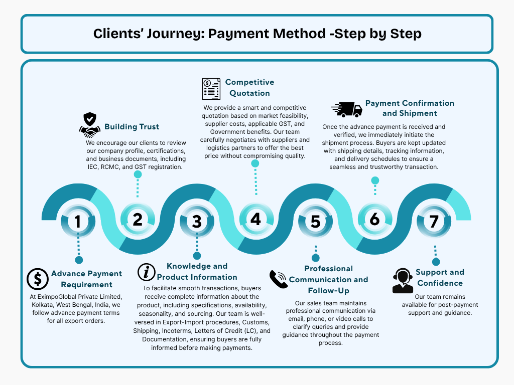 At EximpoGlobal Private Limited, Kolkata, West Bengal, India, we follow advance payment terms for all export orders. This ensures smooth processing and eliminates the risk of payment failure. Buyers are required to make the agreed payment before the shipment is processed, providing security for both parties.